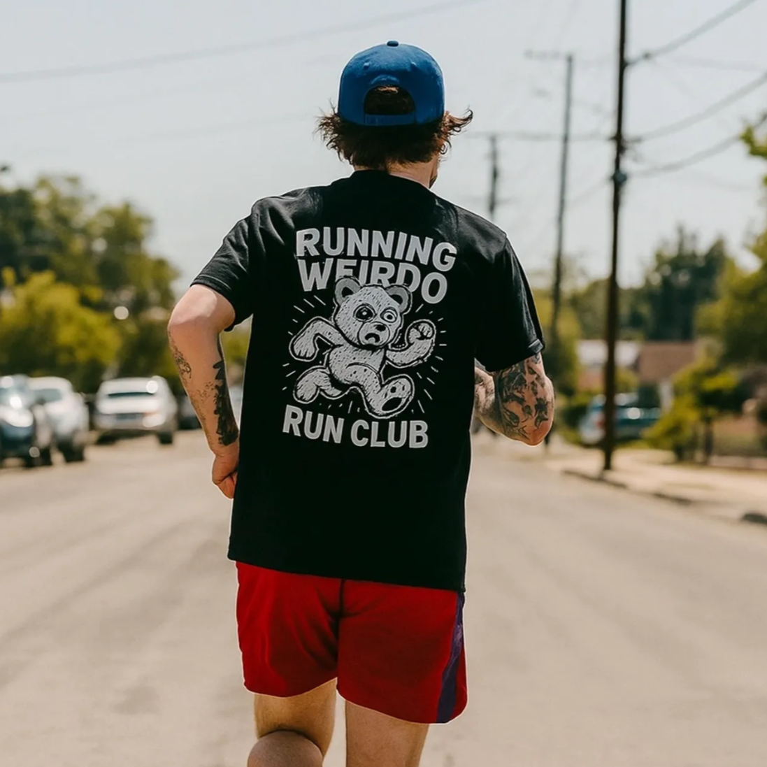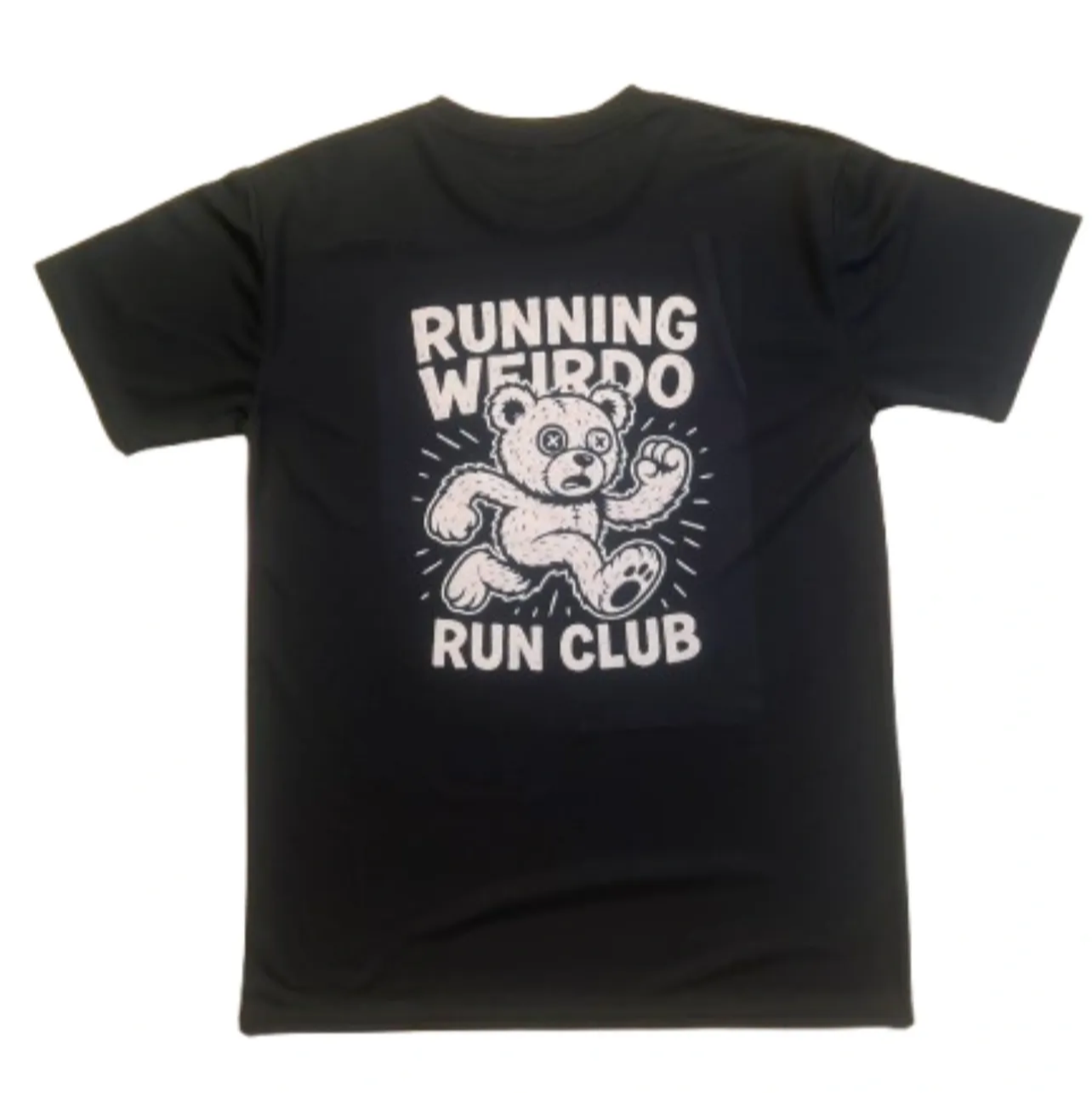 Meet your new running buddy - a slightly unhinged teddy bear who's faster than he looks. This black tech Tee brings the chaos with bold Running Weirdo Run Club graphic across the back< starring our button eyed, mid stride bear. On the front the R.W.R.C logo keeps things low key until you turn around. Run weird. Run free. And if you hear tiny paws behind you.... run faster.